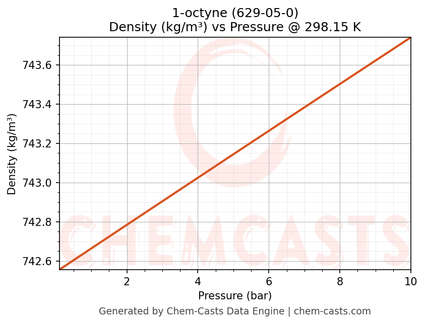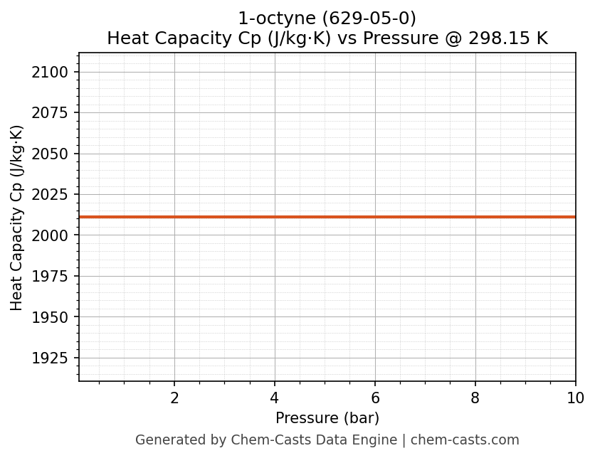 This page presents the pressure-dependent thermodynamic and transport properties of 1-octyne (CAS 629-05-0) calculated at a constant temperature of 298 K (25 °C) over the pressure range 0.10-10 bar.