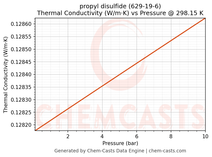 This page presents the pressure-dependent thermodynamic and transport properties of propyl disulfide (CAS 629-19-6) calculated at a constant temperature of 298 K (25 °C) over the pressure range 0.10-10 bar.