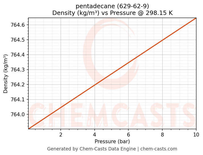 This page presents the pressure-dependent thermodynamic and transport properties of pentadecane (CAS 629-62-9) calculated at a constant temperature of 298 K (25 °C) over the pressure range 0.10-10 bar.