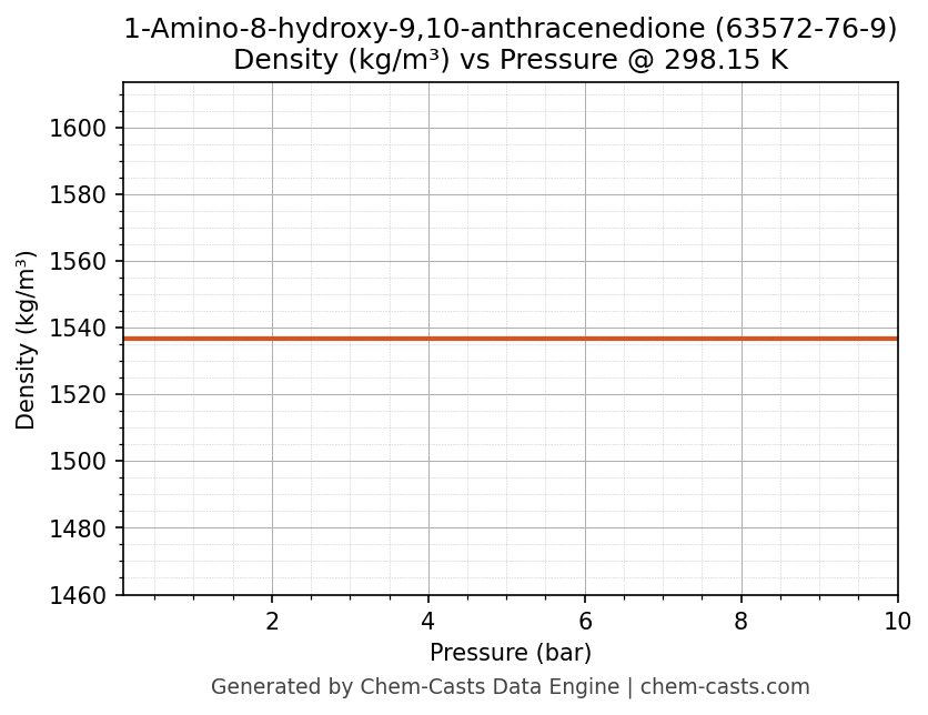 This page presents the pressure-dependent thermodynamic and transport properties of 1-Amino-8-hydroxy-9,10-anthracenedione (CAS 63572-76-9) calculated at a constant temperature of 298 K (25 °C) over the pressure range 0.10-10 bar.