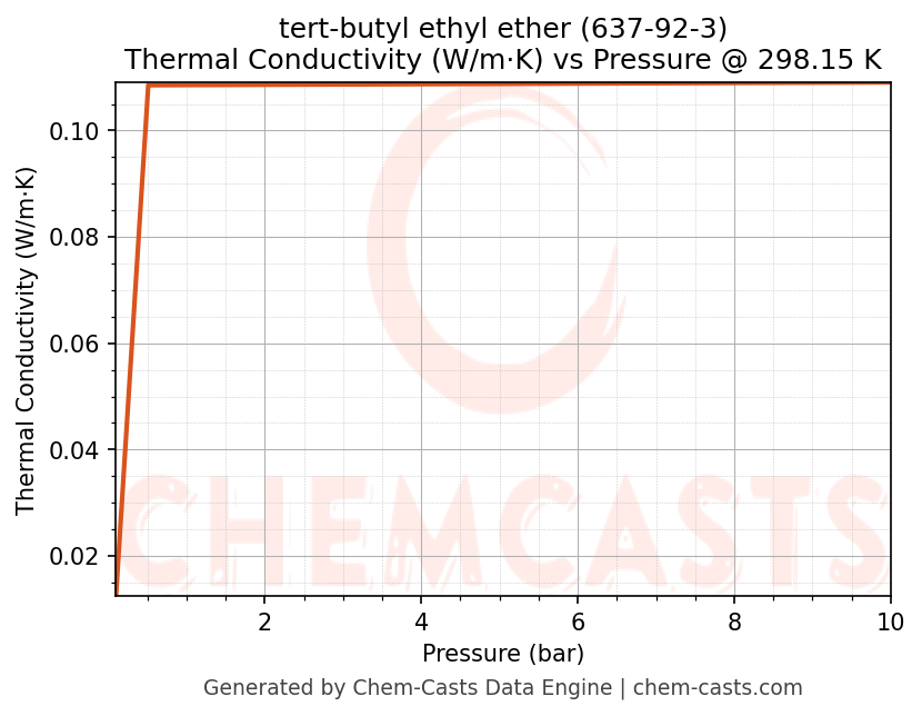 This page presents the pressure-dependent thermodynamic and transport properties of tert-butyl ethyl ether (CAS 637-92-3) calculated at a constant temperature of 298 K (25 °C) over the pressure range 0.10-10 bar.
