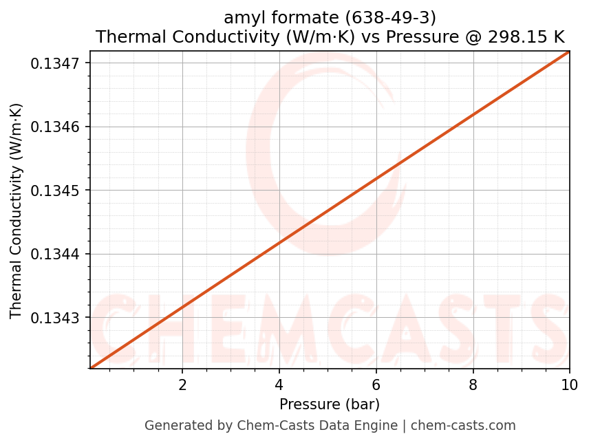 This page presents the pressure-dependent thermodynamic and transport properties of amyl formate (CAS 638-49-3) calculated at a constant temperature of 298 K (25 °C) over the pressure range 0.10-10 bar.