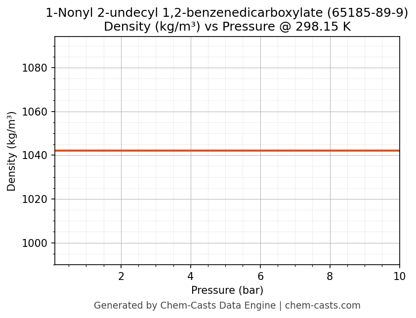 This page presents the pressure-dependent thermodynamic and transport properties of 1-Nonyl 2-undecyl 1,2-benzenedicarboxylate (CAS 65185-89-9) calculated at a constant temperature of 298 K (25 °C) over the pressure range 0.10-10 bar.