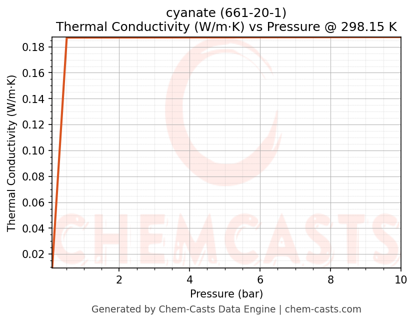 This page presents the pressure-dependent thermodynamic and transport properties of cyanate (CAS 661-20-1) calculated at a constant temperature of 298 K (25 °C) over the pressure range 0.10-10 bar.