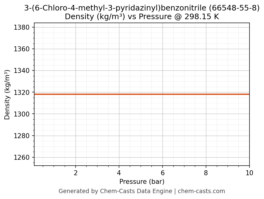 This page presents the pressure-dependent thermodynamic and transport properties of 3-(6-Chloro-4-methyl-3-pyridazinyl)benzonitrile (CAS 66548-55-8) calculated at a constant temperature of 298 K (25 °C) over the pressure range 0.10-10 bar.