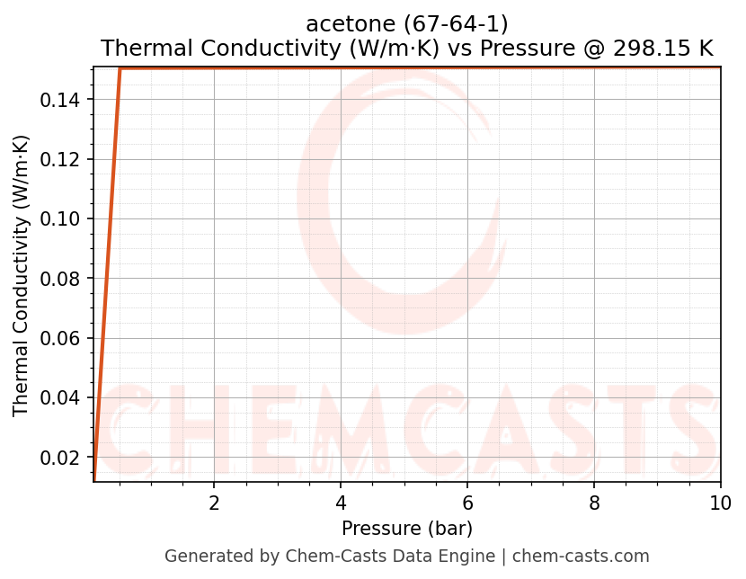 This page presents the pressure-dependent thermodynamic and transport properties of acetone (CAS 67-64-1) calculated at a constant temperature of 298 K (25 °C) over the pressure range 0.10-10 bar.