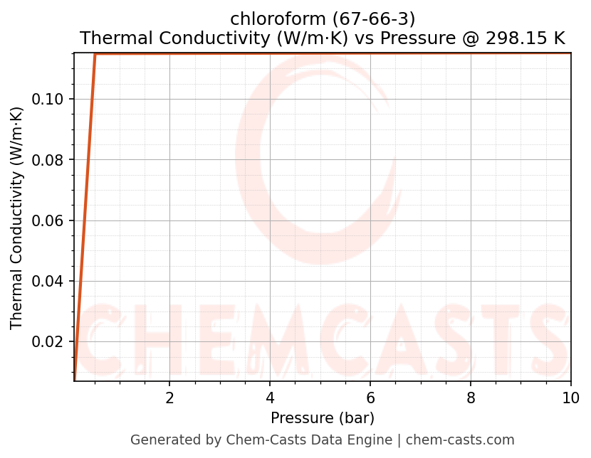 This page presents the pressure-dependent thermodynamic and transport properties of chloroform (CAS 67-66-3) calculated at a constant temperature of 298 K (25 °C) over the pressure range 0.10-10 bar.