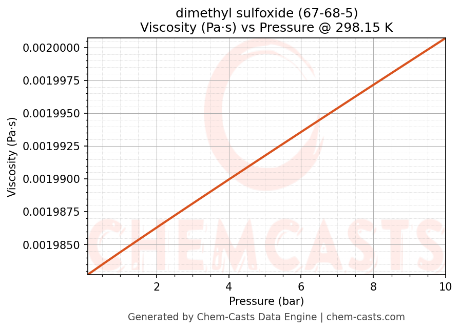 This page presents the pressure-dependent thermodynamic and transport properties of dimethyl sulfoxide (CAS 67-68-5) calculated at a constant temperature of 298 K (25 °C) over the pressure range 0.10-10 bar.