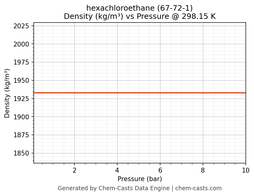 This page presents the pressure-dependent thermodynamic and transport properties of hexachloroethane (CAS 67-72-1) calculated at a constant temperature of 298 K (25 °C) over the pressure range 0.10-10 bar.