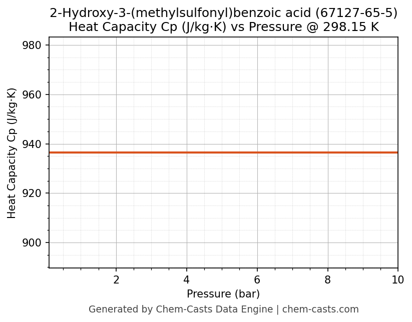 This page presents the pressure-dependent thermodynamic and transport properties of 2-Hydroxy-3-(methylsulfonyl)benzoic acid (CAS 67127-65-5) calculated at a constant temperature of 298 K (25 °C) over the pressure range 0.10-10 bar.