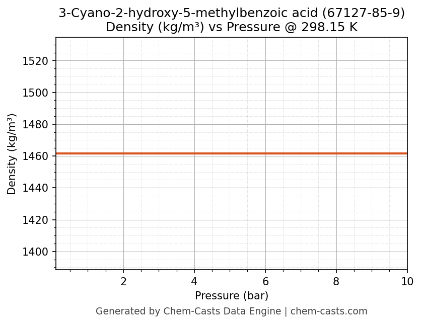 This page presents the pressure-dependent thermodynamic and transport properties of 3-Cyano-2-hydroxy-5-methylbenzoic acid (CAS 67127-85-9) calculated at a constant temperature of 298 K (25 °C) over the pressure range 0.10-10 bar.