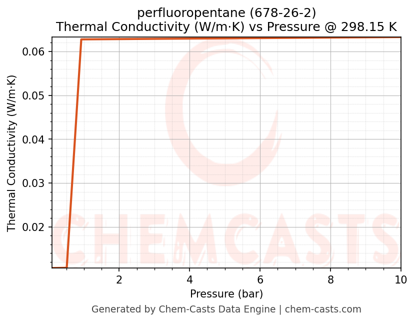 This page presents the pressure-dependent thermodynamic and transport properties of perfluoropentane (CAS 678-26-2) calculated at a constant temperature of 298 K (25 °C) over the pressure range 0.10-10 bar.