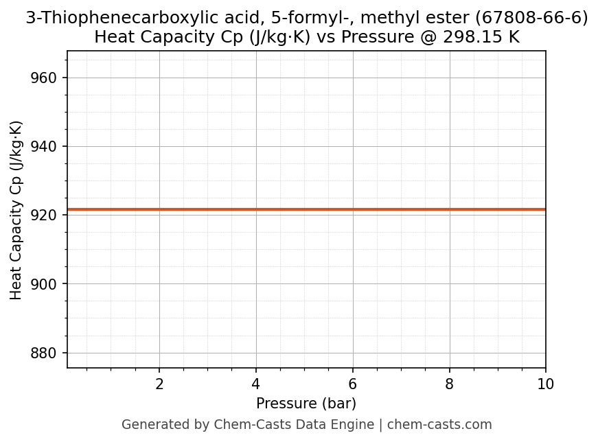 This page presents the pressure-dependent thermodynamic and transport properties of 3-Thiophenecarboxylic acid, 5-formyl-, methyl ester (CAS 67808-66-6) calculated at a constant temperature of 298 K (25 °C) over the pressure range 0.10-10 bar.