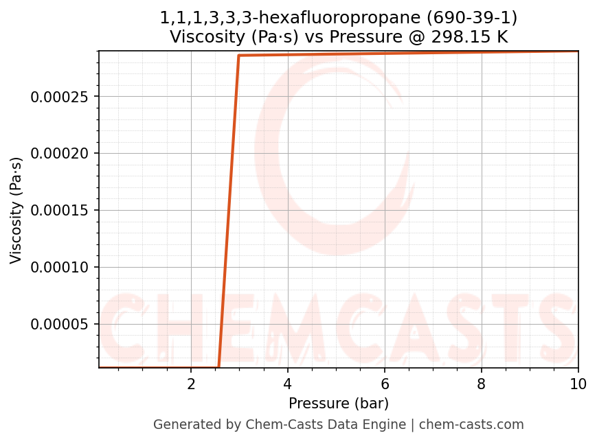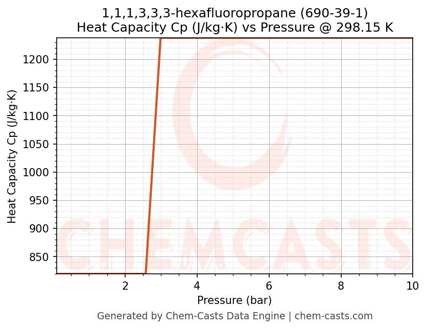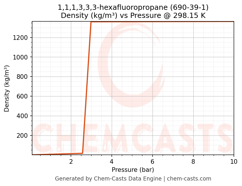 This page presents the pressure-dependent thermodynamic and transport properties of 1,1,1,3,3,3-hexafluoropropane (CAS 690-39-1) calculated at a constant temperature of 298 K (25 °C) over the pressure range 0.10-10 bar.