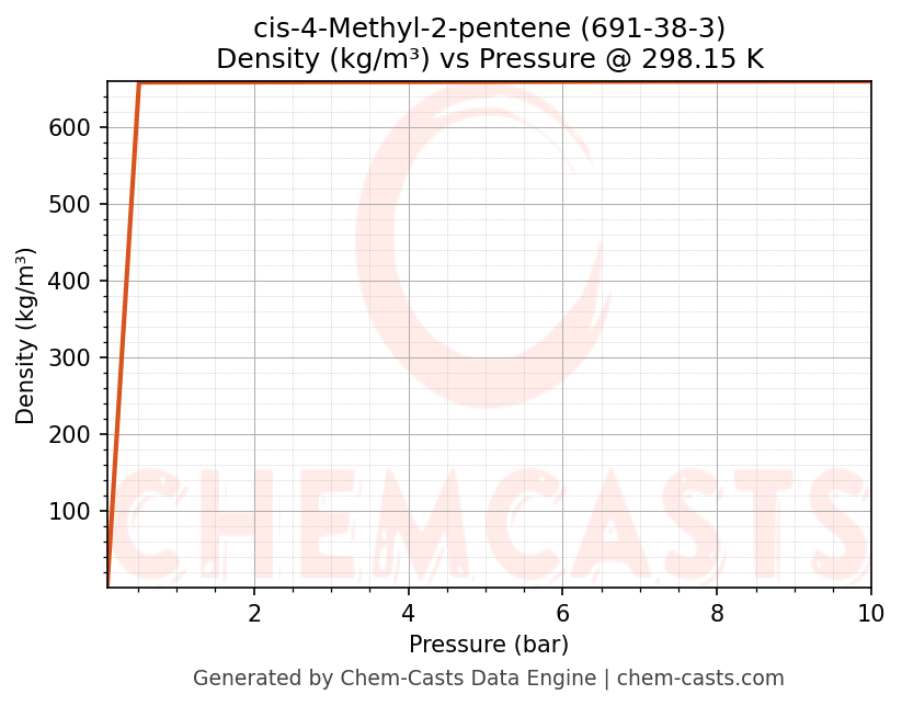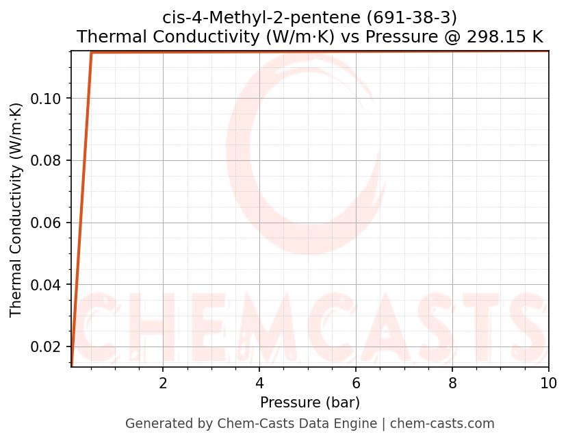 This page presents the pressure-dependent thermodynamic and transport properties of cis-4-Methyl-2-pentene (CAS 691-38-3) calculated at a constant temperature of 298 K (25 °C) over the pressure range 0.10-10 bar.