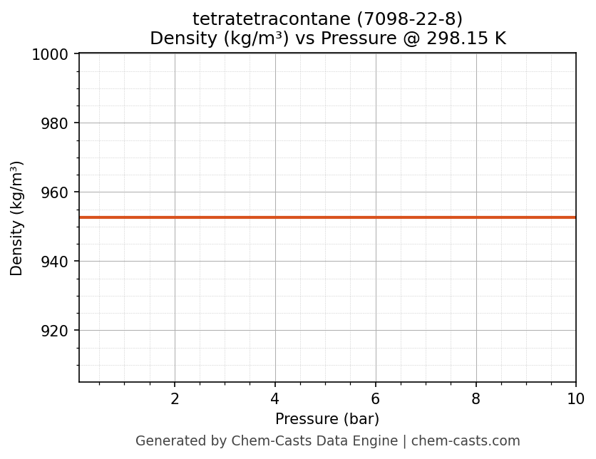 This page presents the pressure-dependent thermodynamic and transport properties of tetratetracontane (CAS 7098-22-8) calculated at a constant temperature of 298 K (25 °C) over the pressure range 0.10-10 bar.