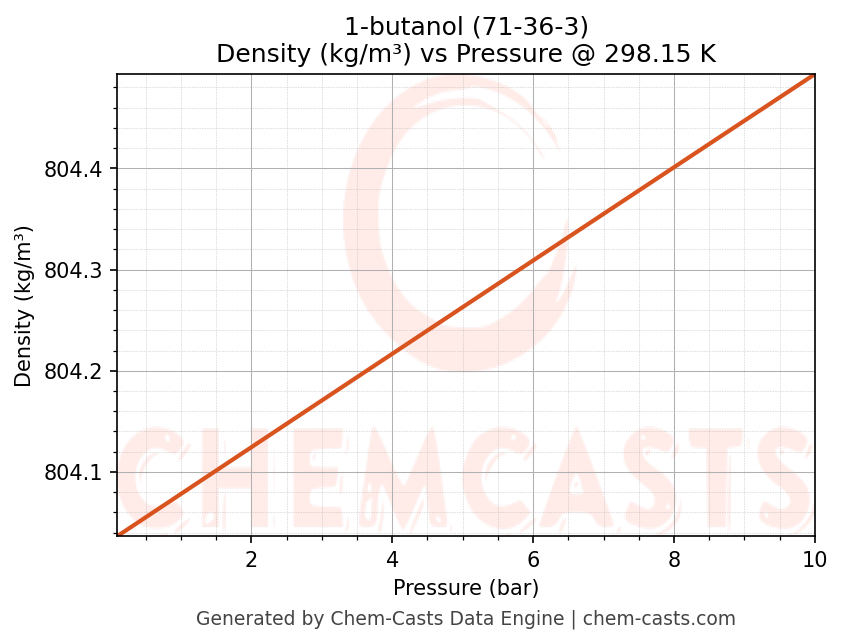 This page presents the pressure-dependent thermodynamic and transport properties of 1-butanol (CAS 71-36-3) calculated at a constant temperature of 298 K (25 °C) over the pressure range 0.10-10 bar.