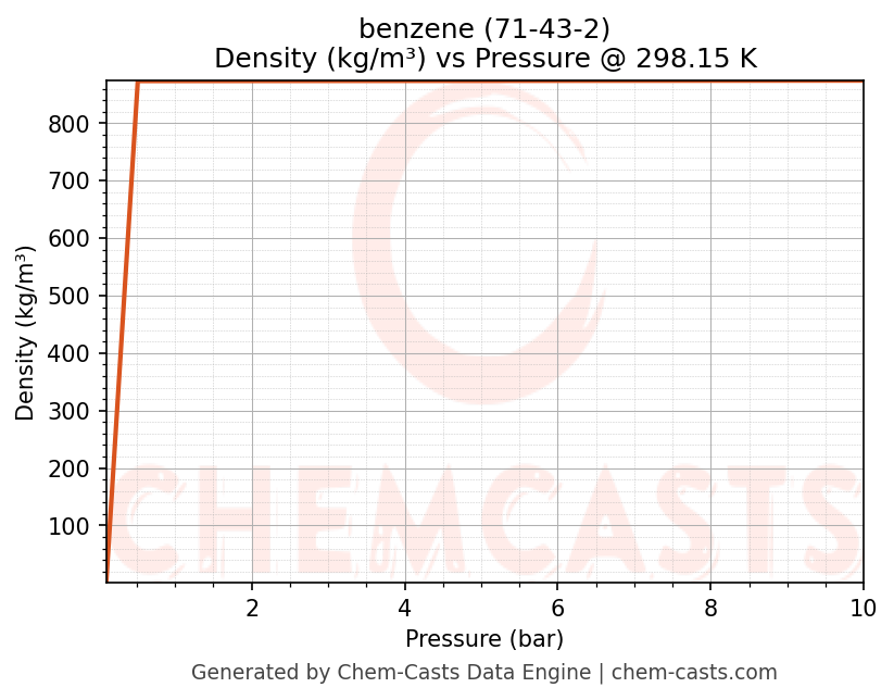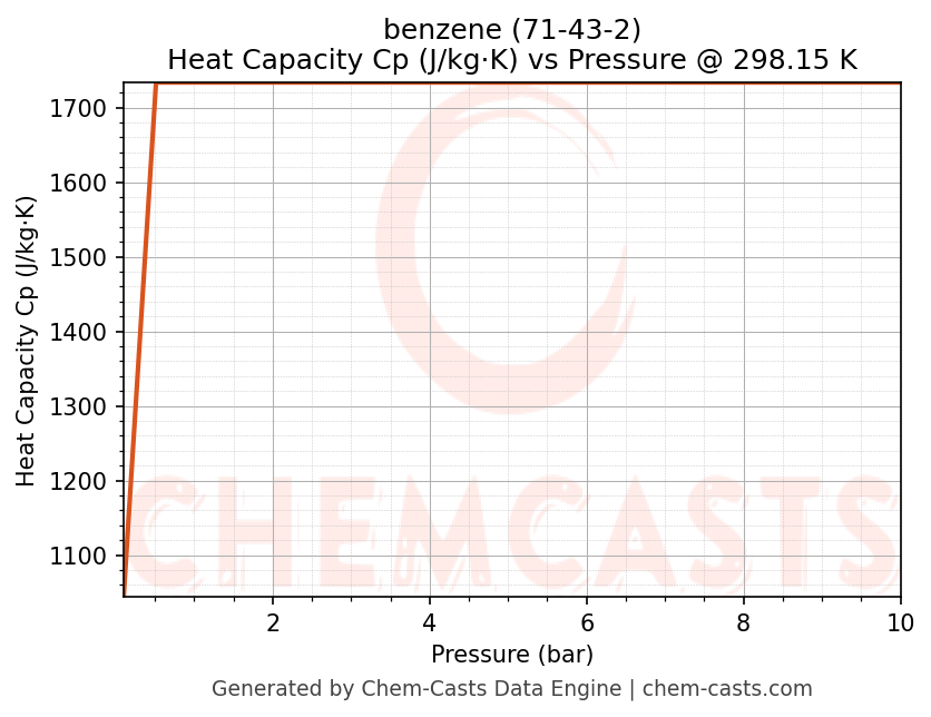 This page presents the pressure-dependent thermodynamic and transport properties of benzene (CAS 71-43-2) calculated at a constant temperature of 298 K (25 °C) over the pressure range 0.10-10 bar.
