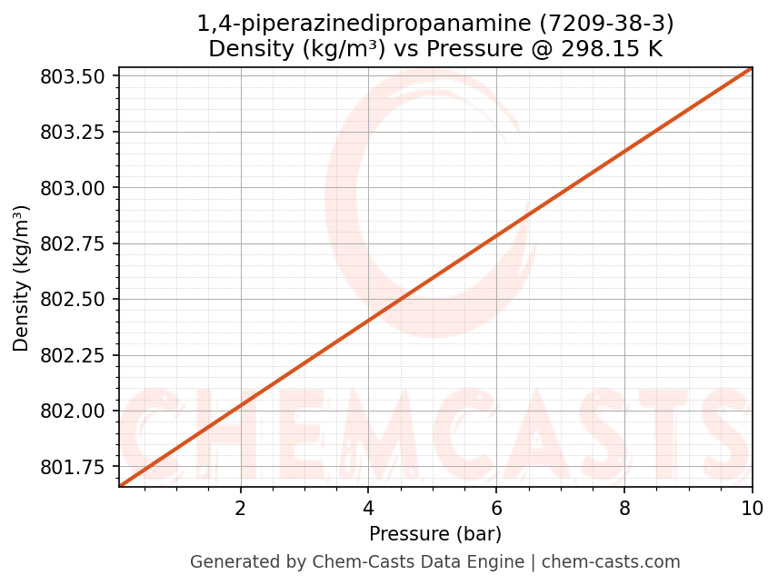 This page presents the pressure-dependent thermodynamic and transport properties of 1,4-piperazinedipropanamine (CAS 7209-38-3) calculated at a constant temperature of 298 K (25 °C) over the pressure range 0.10-10 bar.