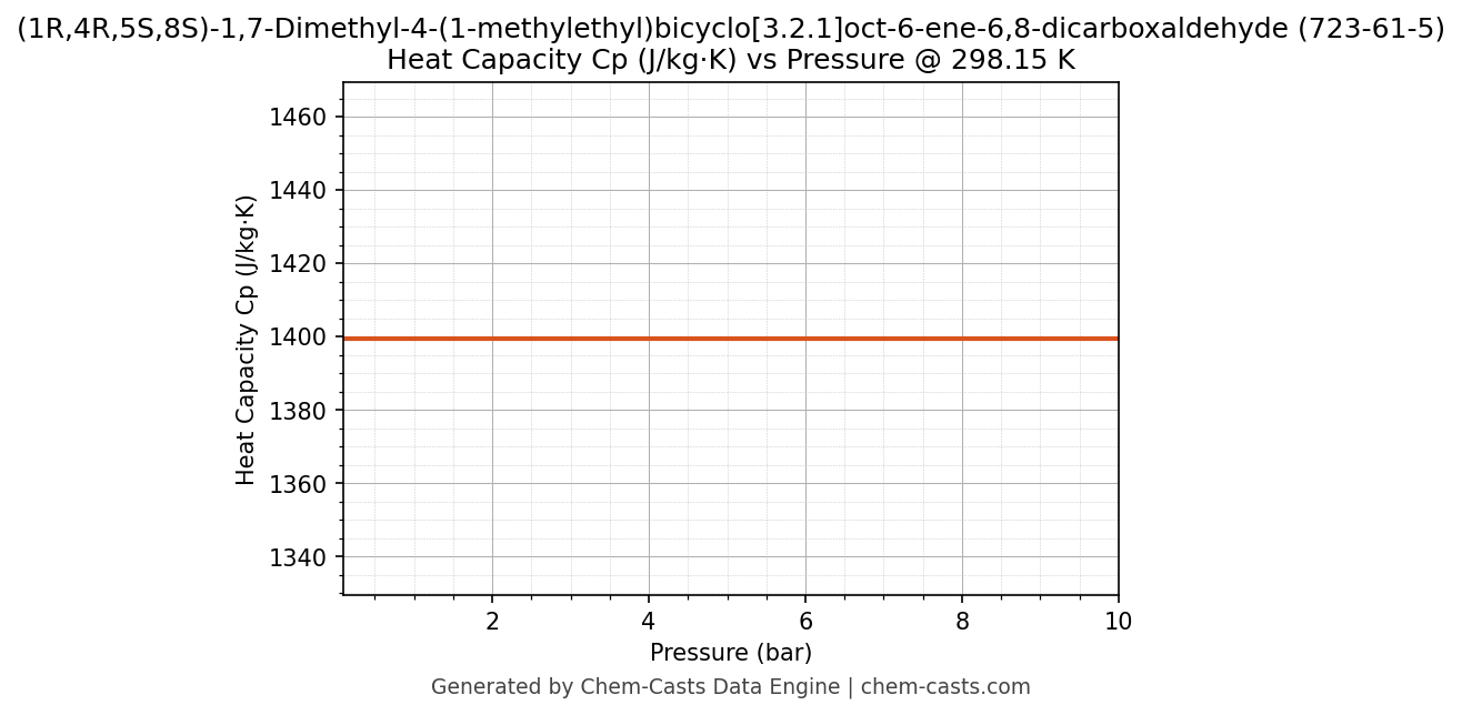 This page presents the pressure-dependent thermodynamic and transport properties of (1R,4R,5S,8S)-1,7-Dimethyl-4-(1-methylethyl)bicyclo[3.2.1]oct-6-ene-6,8-dicarboxaldehyde (CAS 723-61-5) calculated at a constant temperature of 298 K (25 °C) over the pressure range 0.10-10 bar.