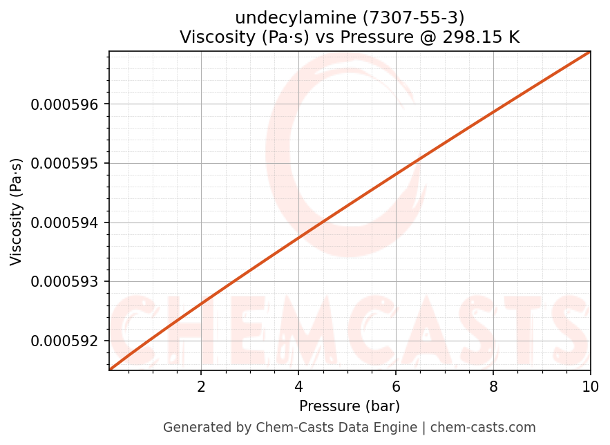 This page presents the pressure-dependent thermodynamic and transport properties of undecylamine (CAS 7307-55-3) calculated at a constant temperature of 298 K (25 °C) over the pressure range 0.10-10 bar.