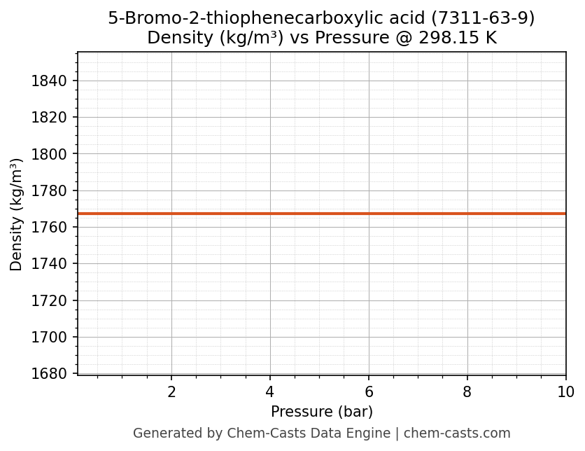 This page presents the pressure-dependent thermodynamic and transport properties of 5-Bromo-2-thiophenecarboxylic acid (CAS 7311-63-9) calculated at a constant temperature of 298 K (25 °C) over the pressure range 0.10-10 bar.