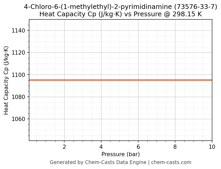 This page presents the pressure-dependent thermodynamic and transport properties of 4-Chloro-6-(1-methylethyl)-2-pyrimidinamine (CAS 73576-33-7) calculated at a constant temperature of 298 K (25 °C) over the pressure range 0.10-10 bar.