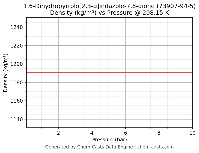 This page presents the pressure-dependent thermodynamic and transport properties of 1,6-Dihydropyrrolo[2,3-g]indazole-7,8-dione (CAS 73907-94-5) calculated at a constant temperature of 298 K (25 °C) over the pressure range 0.10-10 bar.