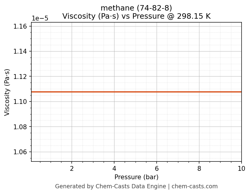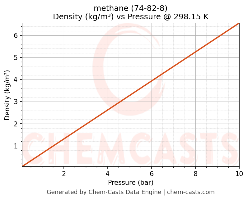 This page presents the pressure-dependent thermodynamic and transport properties of methane (CAS 74-82-8) calculated at a constant temperature of 298 K (25 °C) over the pressure range 0.10-10 bar.
