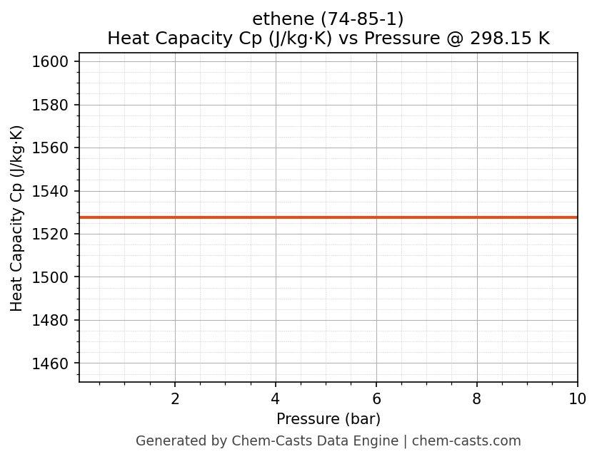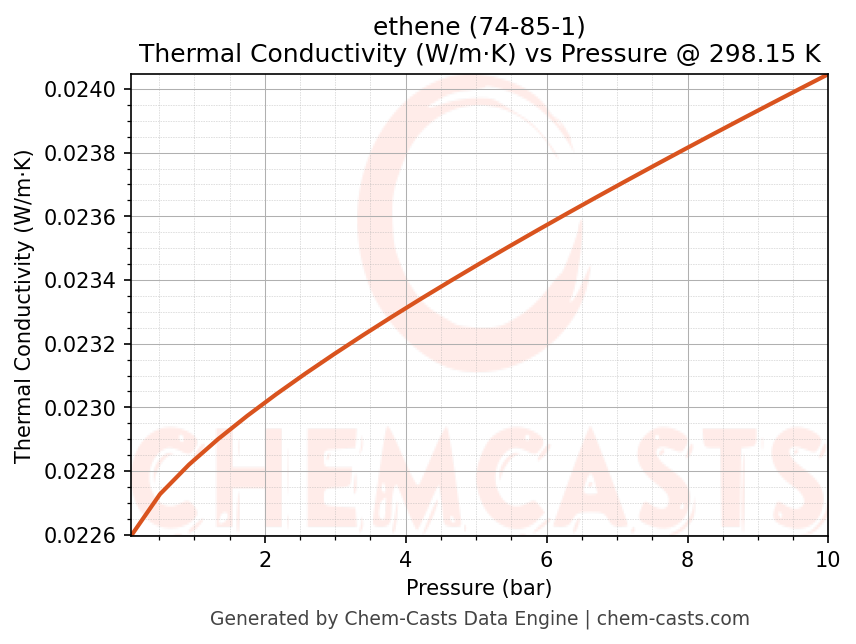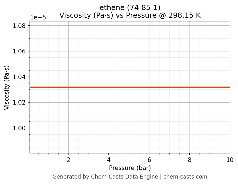 This page presents the pressure-dependent thermodynamic and transport properties of ethene (CAS 74-85-1) calculated at a constant temperature of 298 K (25 °C) over the pressure range 0.10-10 bar.