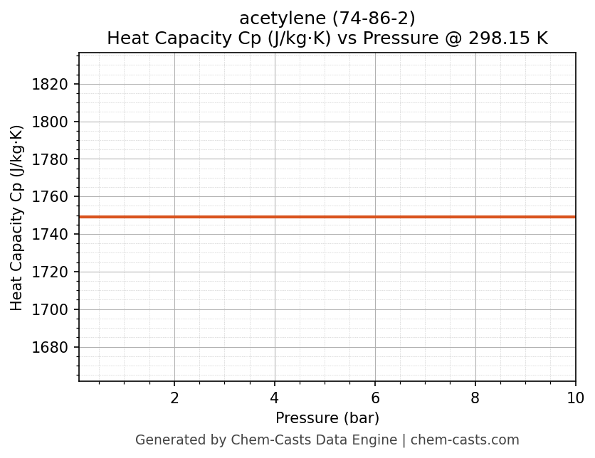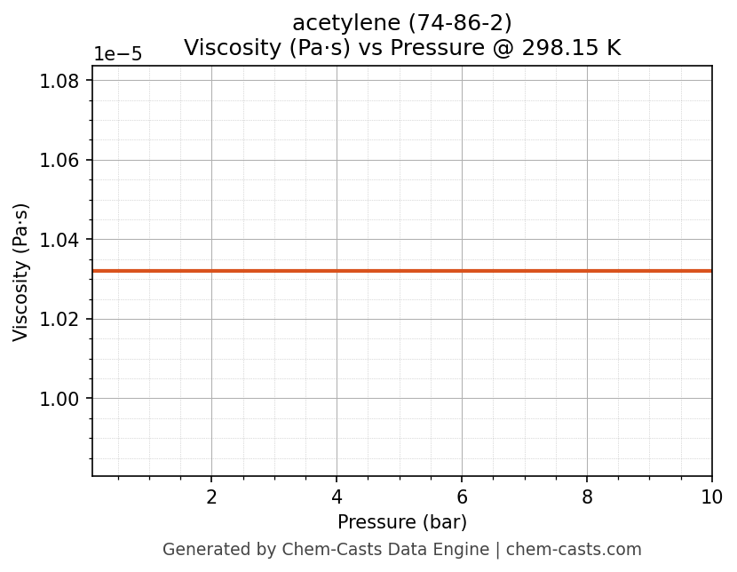 This page presents the pressure-dependent thermodynamic and transport properties of acetylene (CAS 74-86-2) calculated at a constant temperature of 298 K (25 °C) over the pressure range 0.10-10 bar.
