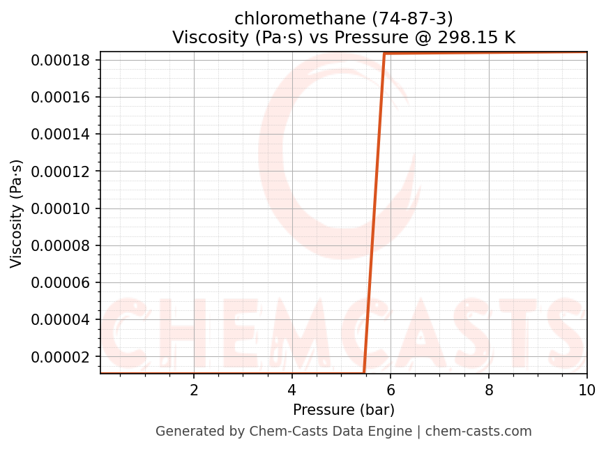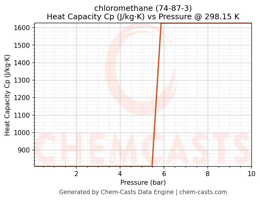 This page presents the pressure-dependent thermodynamic and transport properties of chloromethane (CAS 74-87-3) calculated at a constant temperature of 298 K (25 °C) over the pressure range 0.10-10 bar.