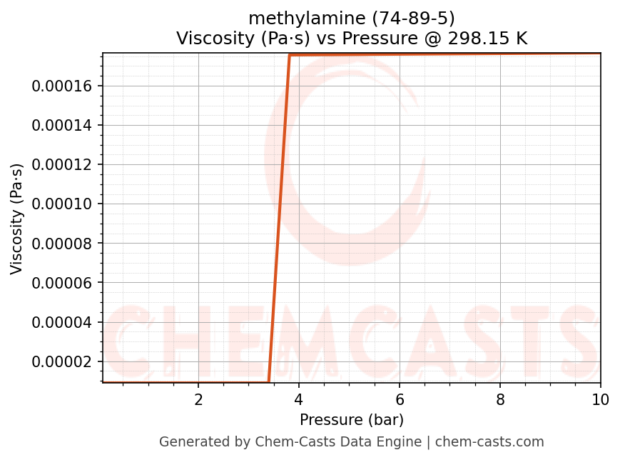 This page presents the pressure-dependent thermodynamic and transport properties of methylamine (CAS 74-89-5) calculated at a constant temperature of 298 K (25 °C) over the pressure range 0.10-10 bar.