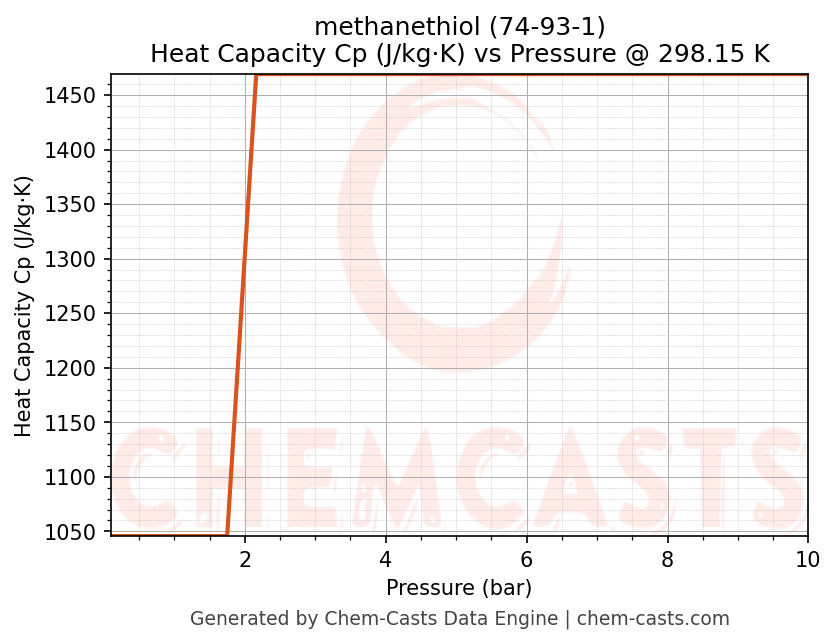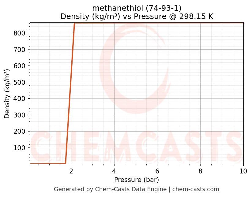 This page presents the pressure-dependent thermodynamic and transport properties of methanethiol (CAS 74-93-1) calculated at a constant temperature of 298 K (25 °C) over the pressure range 0.10-10 bar.