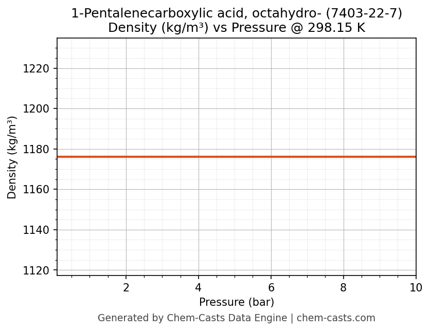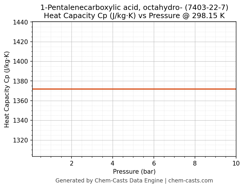 This page presents the pressure-dependent thermodynamic and transport properties of 1-Pentalenecarboxylic acid, octahydro- (CAS 7403-22-7) calculated at a constant temperature of 298 K (25 °C) over the pressure range 0.10-10 bar.