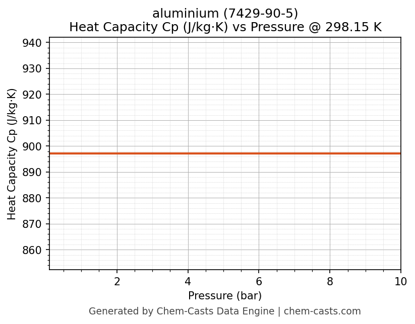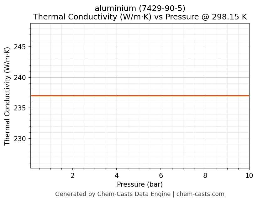 This page presents the pressure-dependent thermodynamic and transport properties of aluminium (CAS 7429-90-5) calculated at a constant temperature of 298 K (25 °C) over the pressure range 0.10-10 bar.