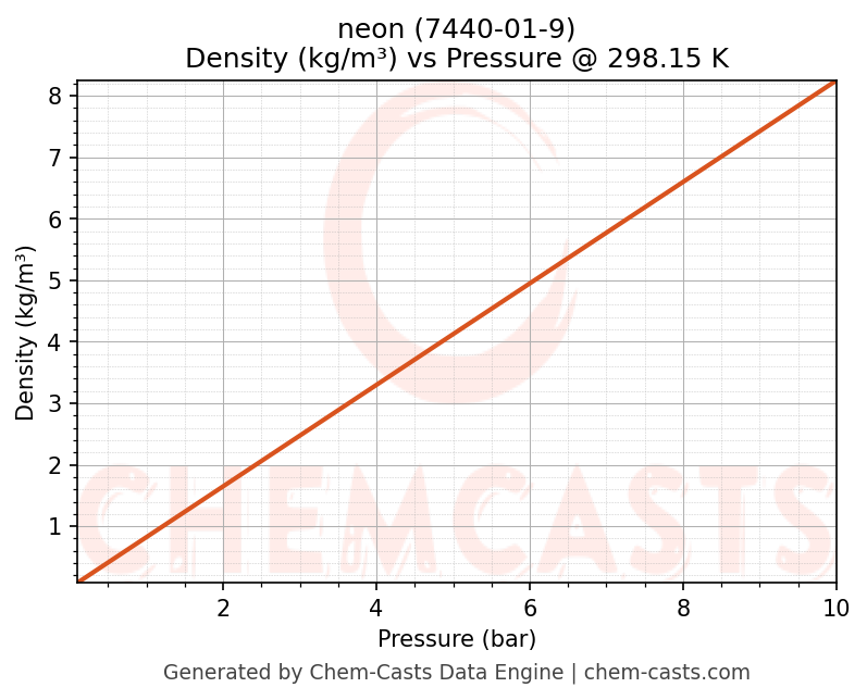 This page presents the pressure-dependent thermodynamic and transport properties of neon (CAS 7440-01-9) calculated at a constant temperature of 298 K (25 °C) over the pressure range 0.10-10 bar.
