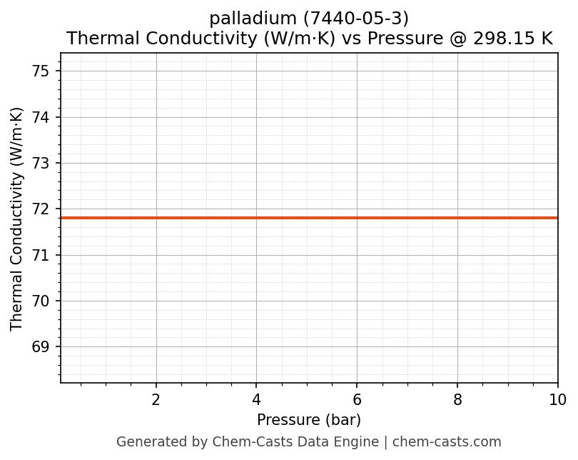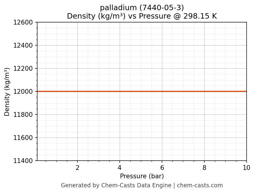 This page presents the pressure-dependent thermodynamic and transport properties of palladium (CAS 7440-05-3) calculated at a constant temperature of 298 K (25 °C) over the pressure range 0.10-10 bar.