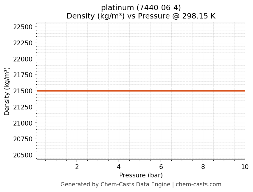 This page presents the pressure-dependent thermodynamic and transport properties of platinum (CAS 7440-06-4) calculated at a constant temperature of 298 K (25 °C) over the pressure range 0.10-10 bar.
