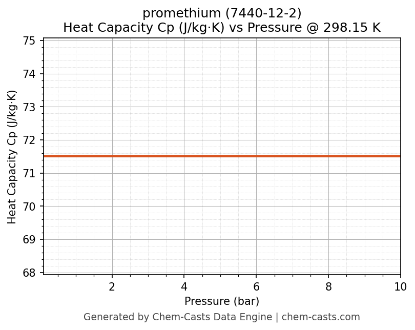 This page presents the pressure-dependent thermodynamic and transport properties of promethium (CAS 7440-12-2) calculated at a constant temperature of 298 K (25 °C) over the pressure range 0.10-10 bar.