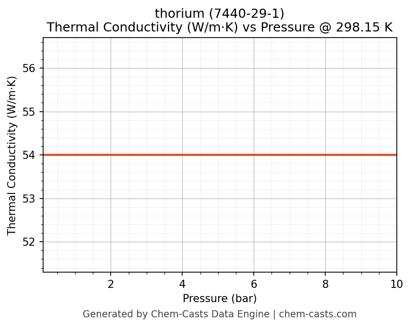 This page presents the pressure-dependent thermodynamic and transport properties of thorium (CAS 7440-29-1) calculated at a constant temperature of 298 K (25 °C) over the pressure range 0.10-10 bar.