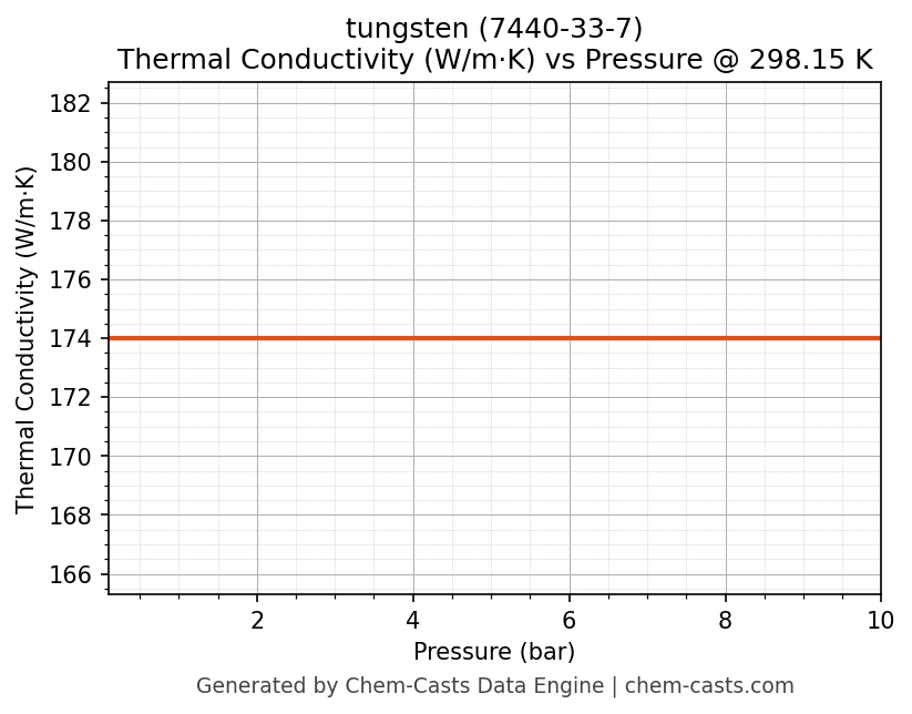 This page presents the pressure-dependent thermodynamic and transport properties of tungsten (CAS 7440-33-7) calculated at a constant temperature of 298 K (25 °C) over the pressure range 0.10-10 bar.