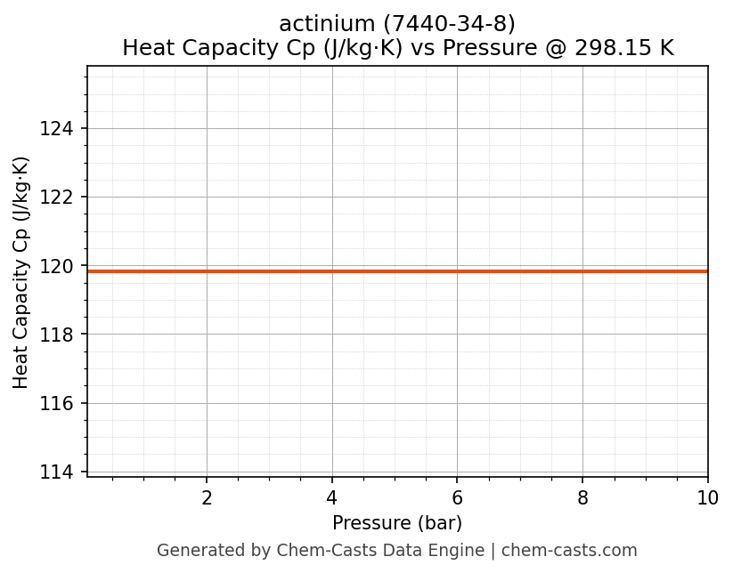 This page presents the pressure-dependent thermodynamic and transport properties of actinium (CAS 7440-34-8) calculated at a constant temperature of 298 K (25 °C) over the pressure range 0.10-10 bar.