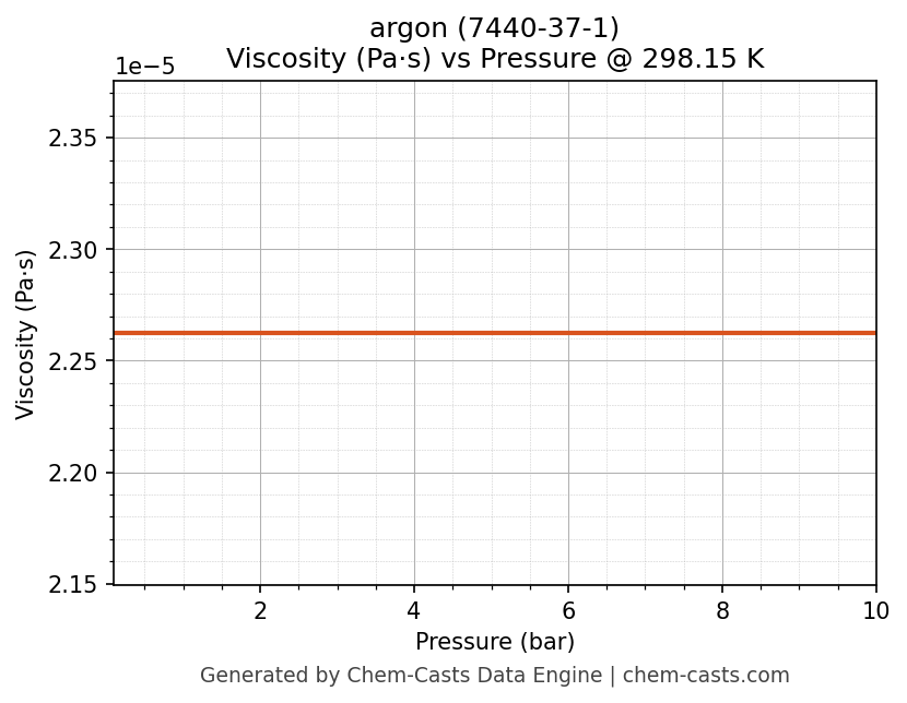 This page presents the pressure-dependent thermodynamic and transport properties of argon (CAS 7440-37-1) calculated at a constant temperature of 298 K (25 °C) over the pressure range 0.10-10 bar.