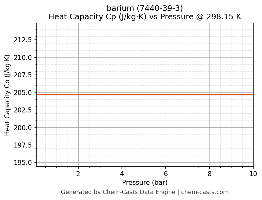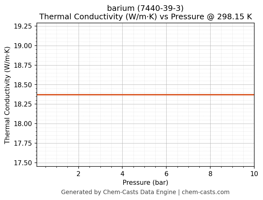 This page presents the pressure-dependent thermodynamic and transport properties of barium (CAS 7440-39-3) calculated at a constant temperature of 298 K (25 °C) over the pressure range 0.10-10 bar.