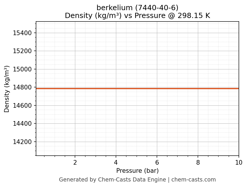This page presents the pressure-dependent thermodynamic and transport properties of berkelium (CAS 7440-40-6) calculated at a constant temperature of 298 K (25 °C) over the pressure range 0.10-10 bar.