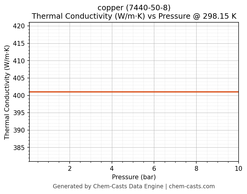 This page presents the pressure-dependent thermodynamic and transport properties of copper (CAS 7440-50-8) calculated at a constant temperature of 298 K (25 °C) over the pressure range 0.10-10 bar.
