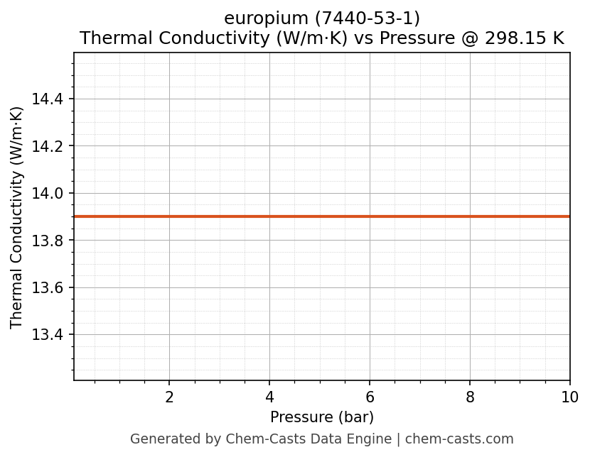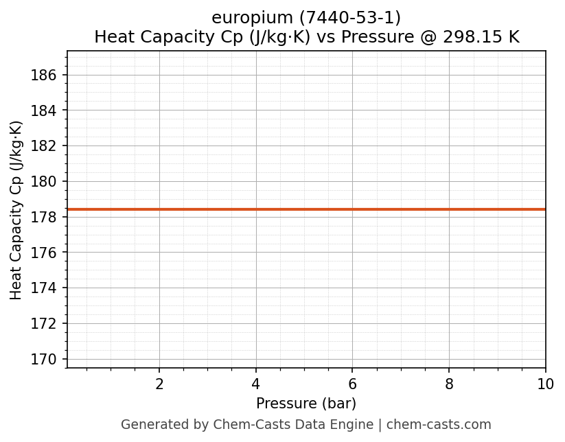 This page presents the pressure-dependent thermodynamic and transport properties of europium (CAS 7440-53-1) calculated at a constant temperature of 298 K (25 °C) over the pressure range 0.10-10 bar.