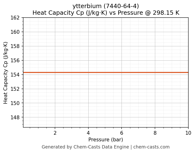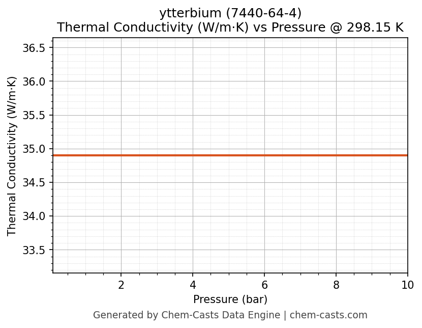 This page presents the pressure-dependent thermodynamic and transport properties of ytterbium (CAS 7440-64-4) calculated at a constant temperature of 298 K (25 °C) over the pressure range 0.10-10 bar.