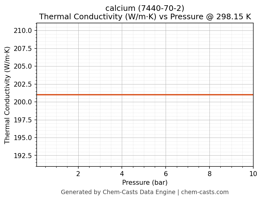 This page presents the pressure-dependent thermodynamic and transport properties of calcium (CAS 7440-70-2) calculated at a constant temperature of 298 K (25 °C) over the pressure range 0.10-10 bar.